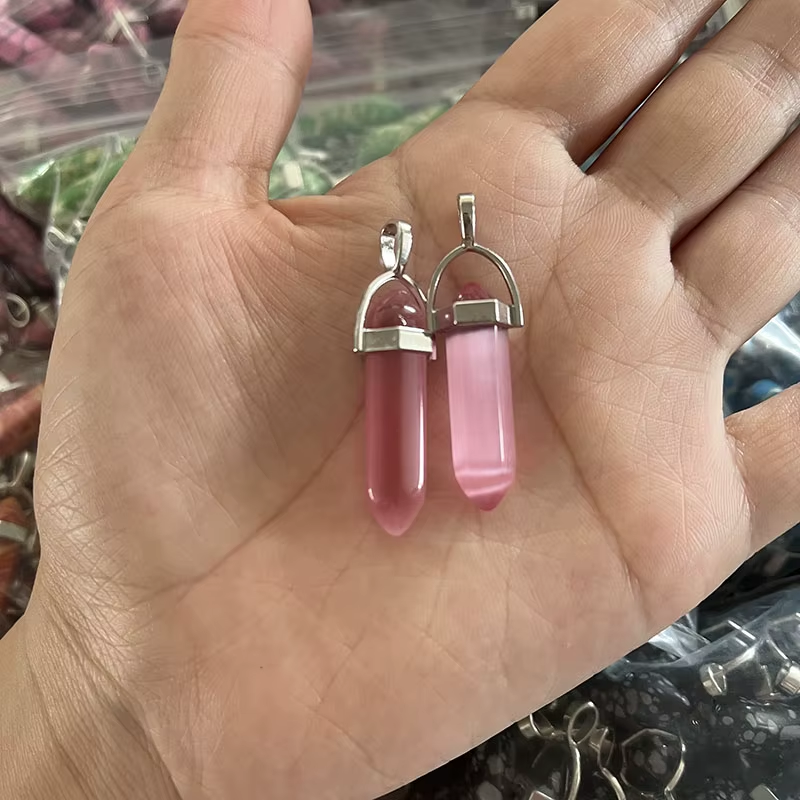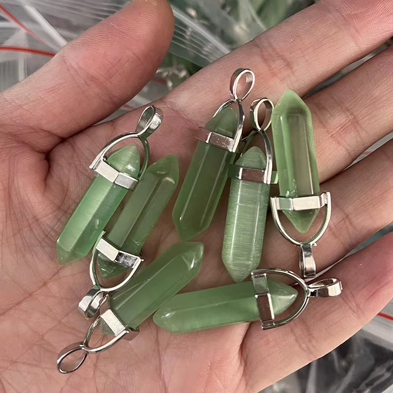 Natural Cat Eye Stone Crystal Bullet Hexagonal Pendulum Necklace